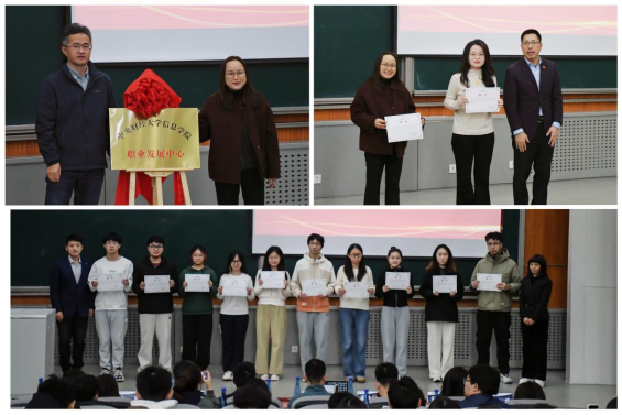 在揭牌环节,朱亭瑶宣读了《关于成立信息学院职业发展中心的决定》,陈振与杨英共同为信息学院职业发展中心揭牌,标志着中心正式启动运行。随后,方德风为校外职业发展导师颁发聘书,谭嗣钰与学院教师晏政共同为学生骨干团队成员颁发聘书。